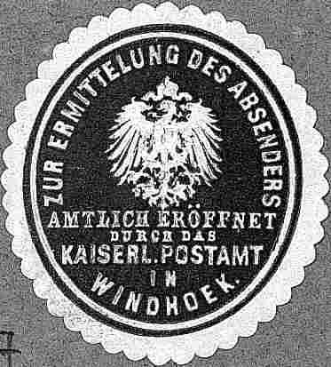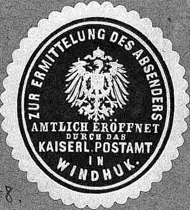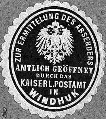 ZUR ERMITTELUNG DES ABSENDERS / AMTLICH GEÖFFNET / DURCH DAS / KAISERL. POSTAMT / IN WINDHUK - oval blau 29x33mm