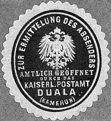 ZUR ERMITTELUNG DES ABSENDERS / AMTLICH GEÖFFNET / DURCH DAS / KAISERL. POSTAMT / DUALA / - KAMERUN - blau oval 29x33mm
